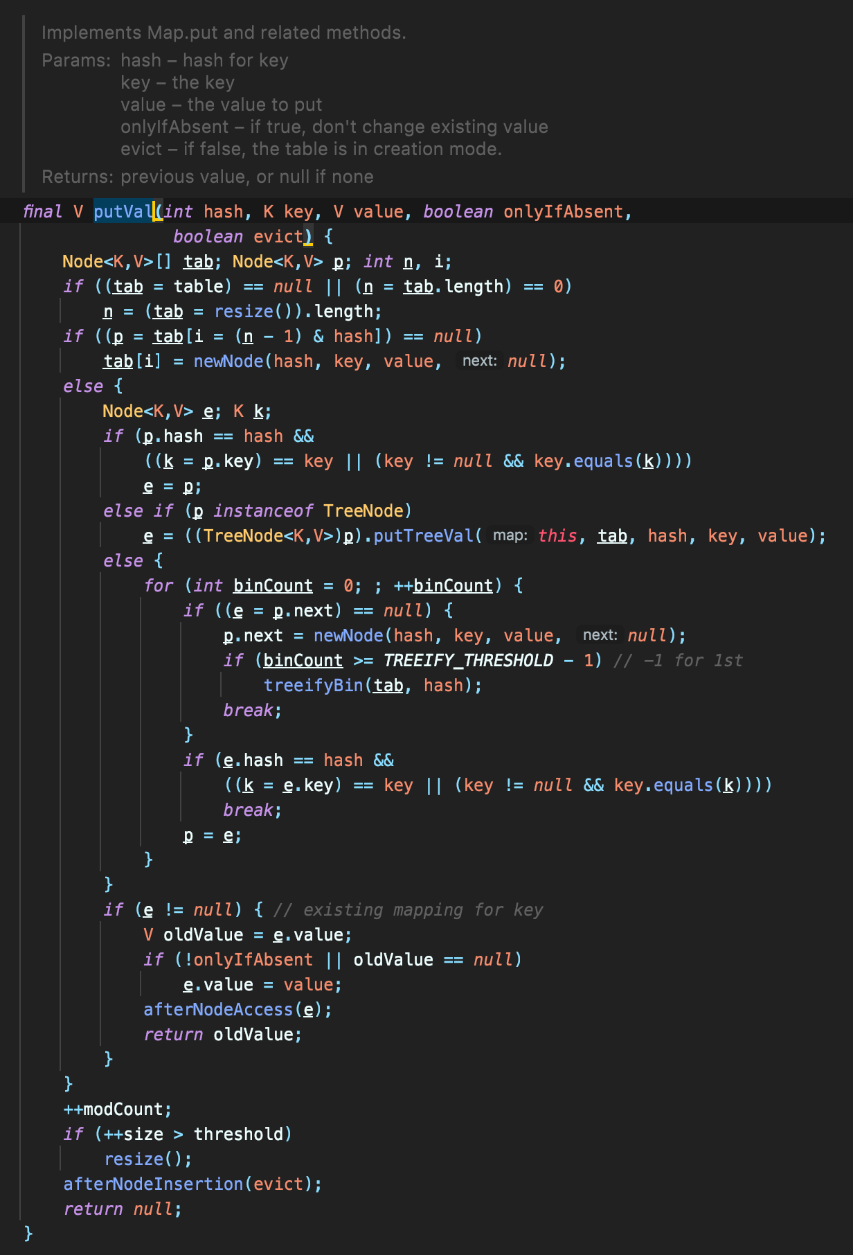 final V putVal(int hash, K key, V value, boolean onlyIfAbsent, boolean evict) {