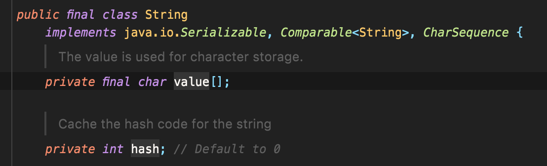 - value[]가 final로 선언되어있어서 immutable 입니다. value가 한 번 대입되면 변하지 않기 때문에 hash 값이 변하지 않을 수 있습니다