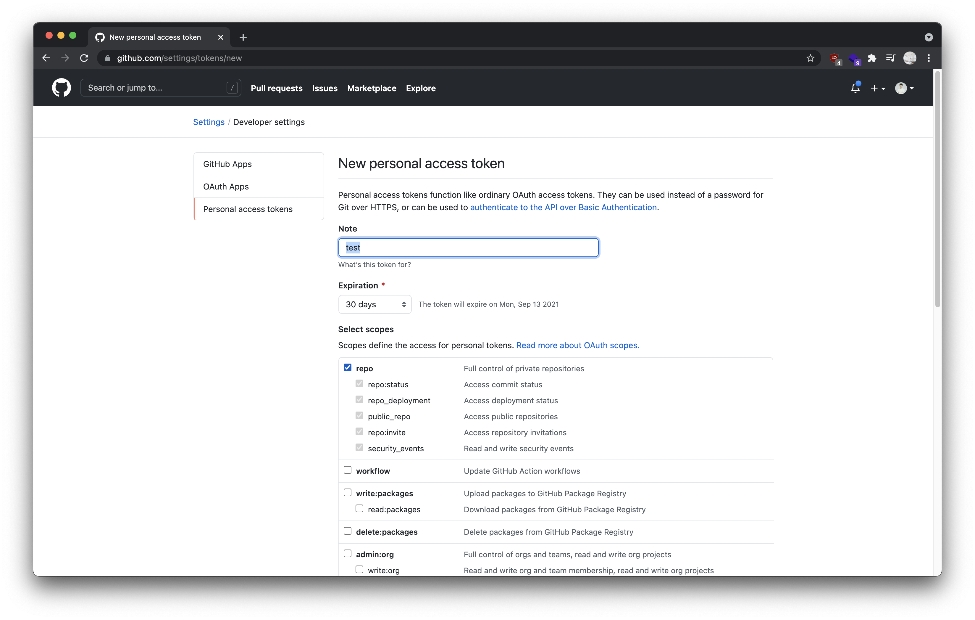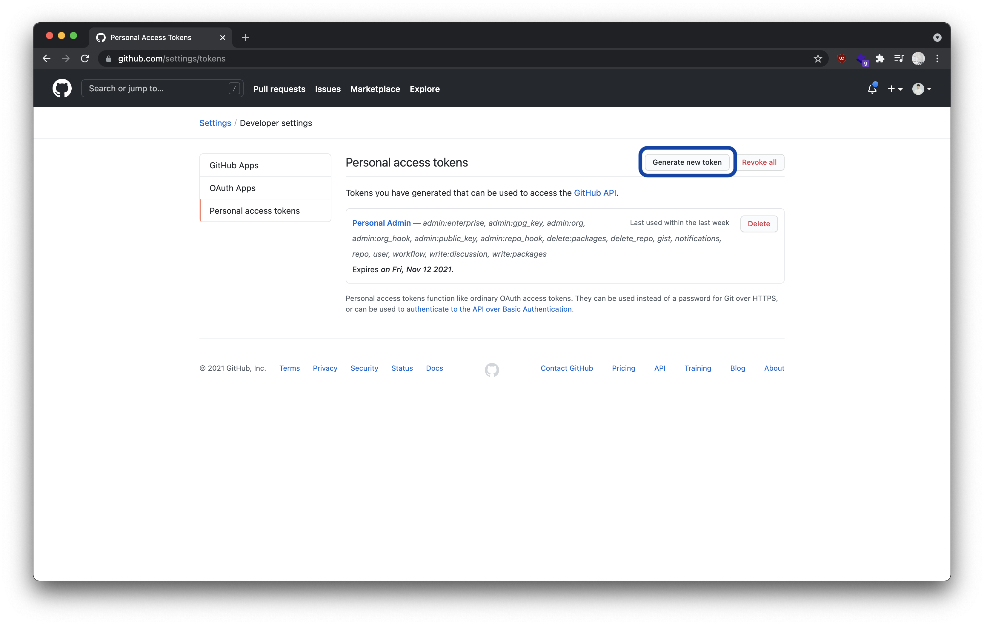 1. https://github.com/settings/tokens 에서 "Generate new token"을 클릭합니다