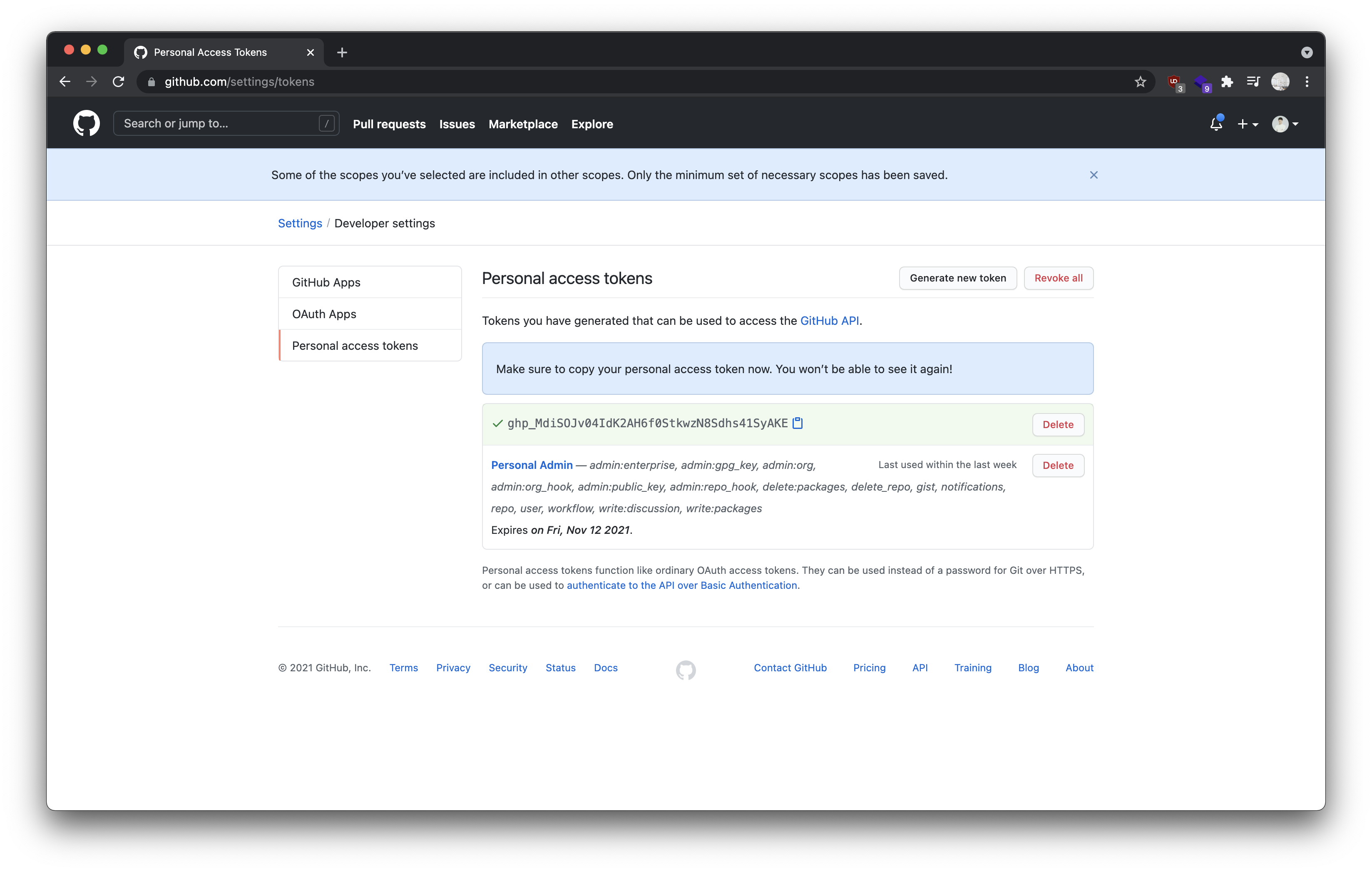 3. 만들어진 access token을 꼭!!! 복사합니다. access token은 한 번만 보여지고 복사 못 하시면 새로 다시 만들어야합니다.